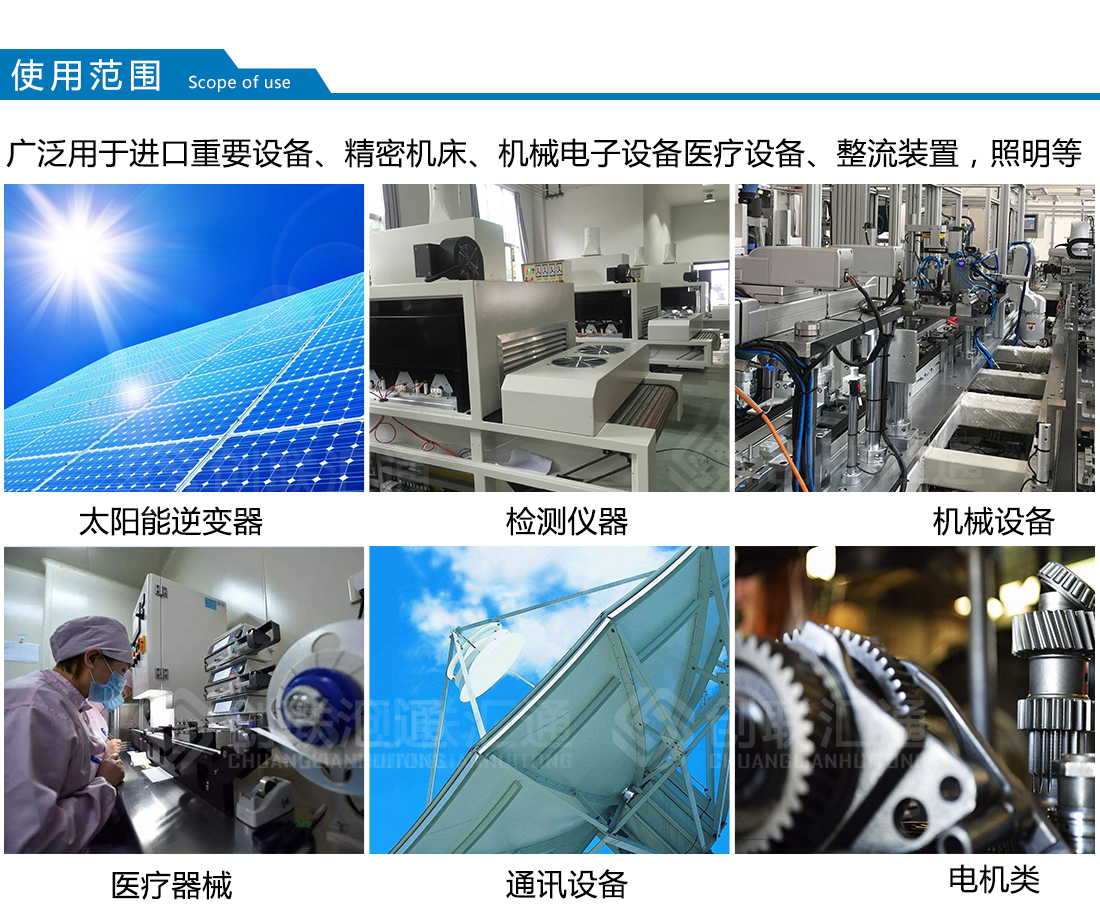 廣泛用于進(jìn)口重要設(shè)備、機(jī)密機(jī)床、機(jī)械電子設(shè)備、醫(yī)療設(shè)備、整流裝置、照明等,安裝場(chǎng)所應(yīng)無嚴(yán)重影響變壓器絕緣強(qiáng)度的氣體,蒸汽,化學(xué)性沉積,污垢,導(dǎo)電塵埃及無其他易爆易燃易腐蝕的物質(zhì)。